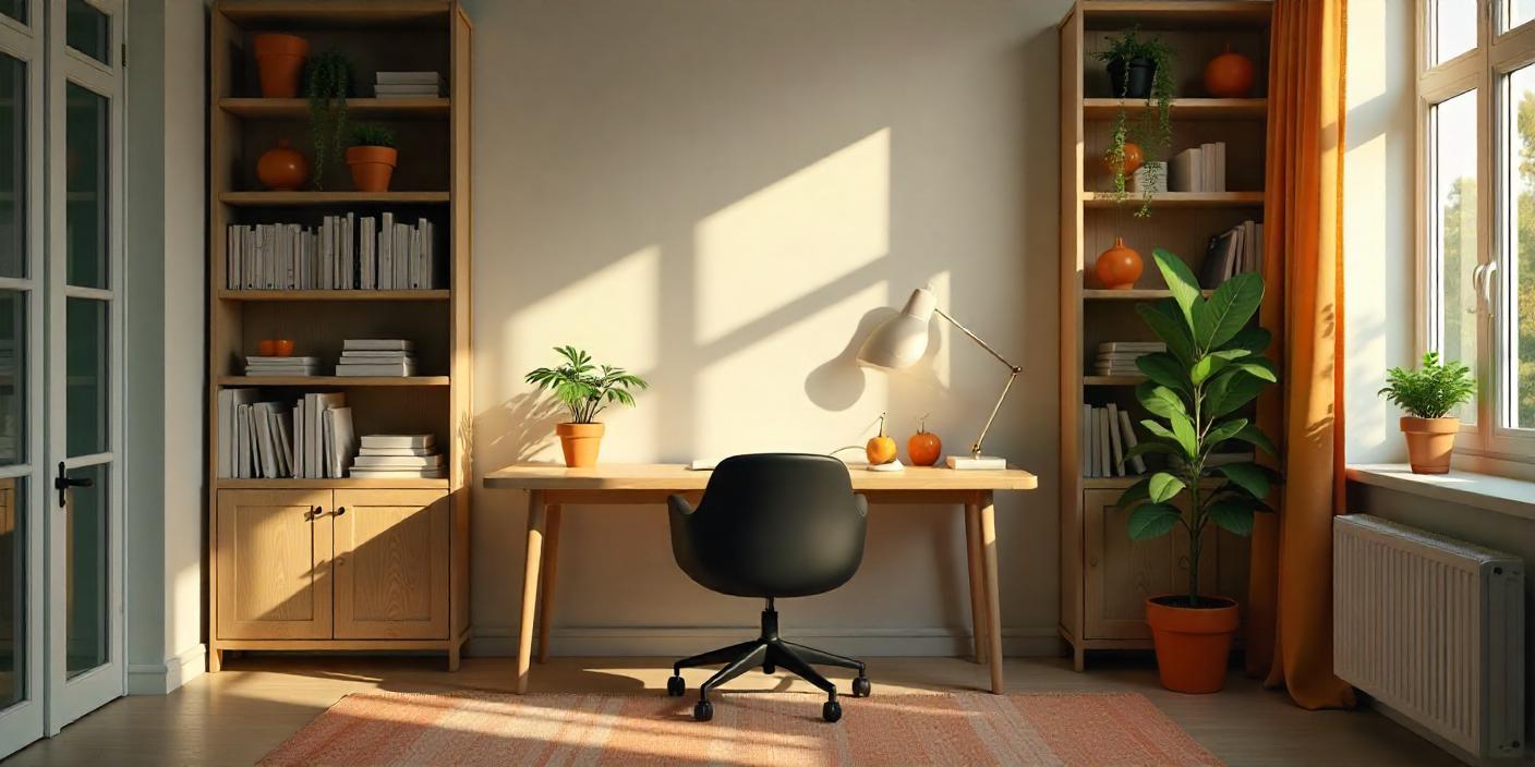 bookcases, books, bright, chair, comfortable, decor, desk, home decor, home office, interior design, natural light, peaceful, plants, potted plants, reading, study, sunlight, window, wooden, workspace
