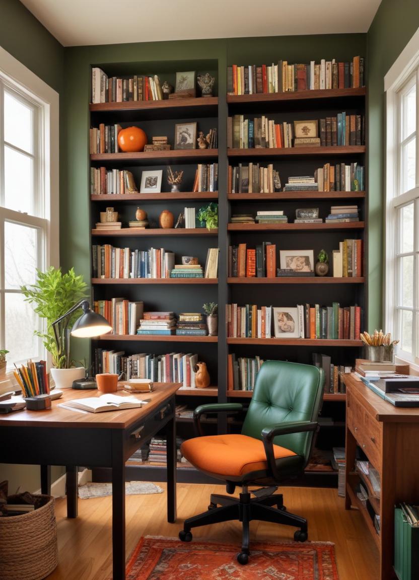 books, bookshelves, brown, chair, desk, desk chair, green, home, home office, lamp, notebook, office, orange, plant, reading, rug, study, window, work, writing