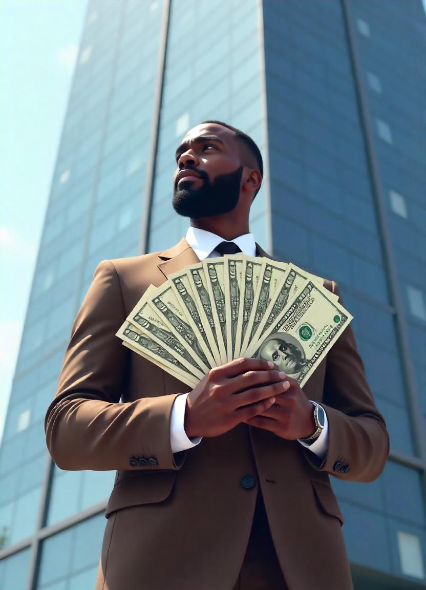 A man in a suit holds cash in front of a skyscraper