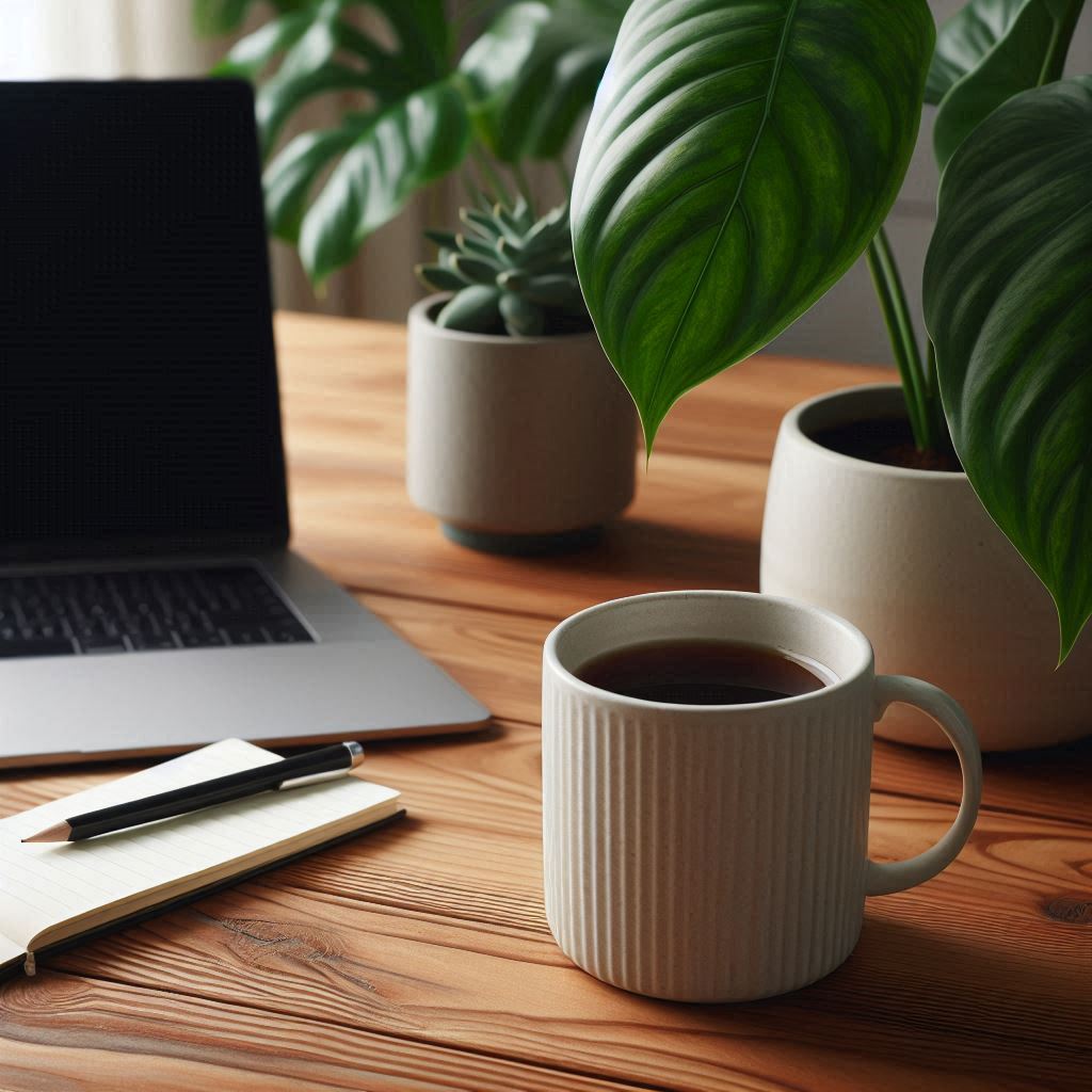 afternoon, coffee, cup, desk, drink, green, home, laptop, leaves, morning, notebook, office, pencil, plant, pot, study, succulent, white, wood, work