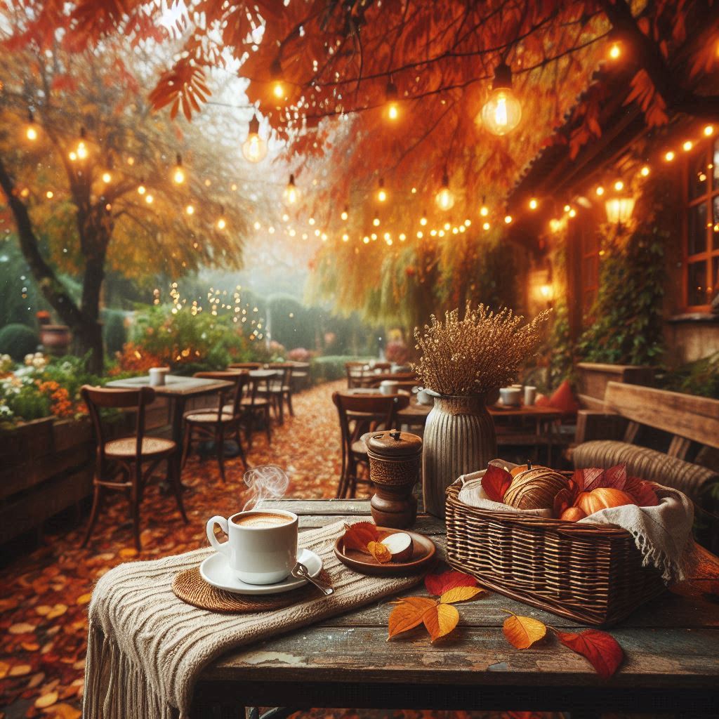 ambiance, autumn, basket, beverage, blanket, cafe, coffee, cozy, decor, drink, fall, leaves, lights, nature, outdoor, patio, relaxing, seasonal, table, warm