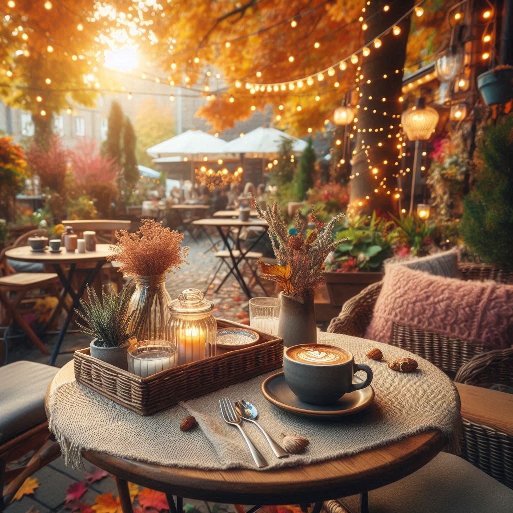 A cup of coffee sits on a table in an outdoor cafe, surrounded by fall foliage and twinkling lights.