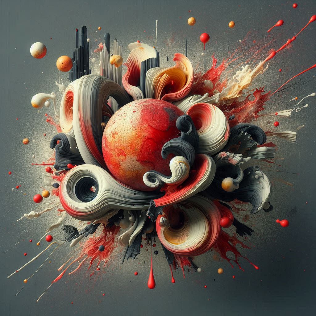 An abstract sphere with a red, orange, and white surface is surrounded by swirling, textured shapes in white, black, and red.