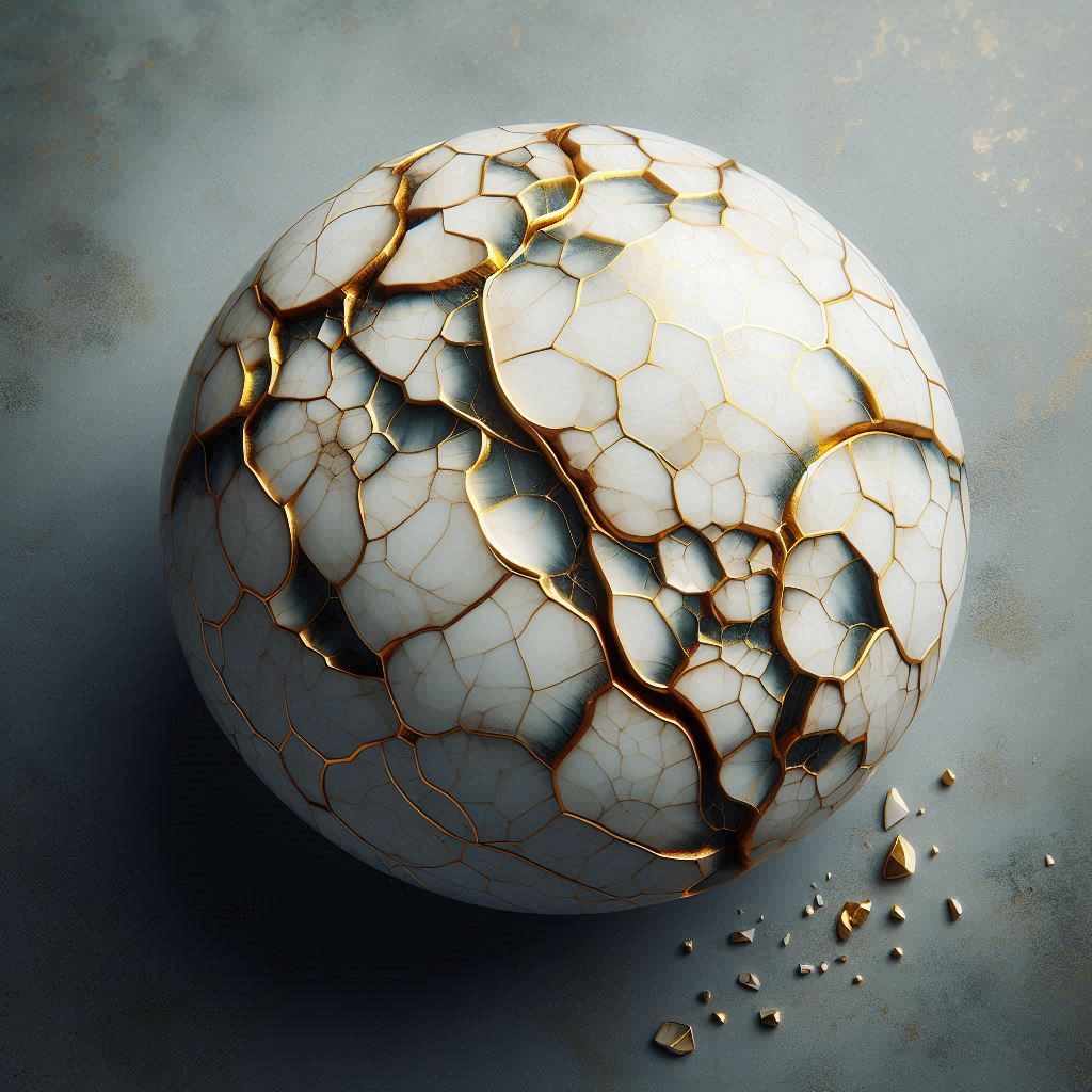 A white sphere, cracked and broken, rests on a dark gray surface.
