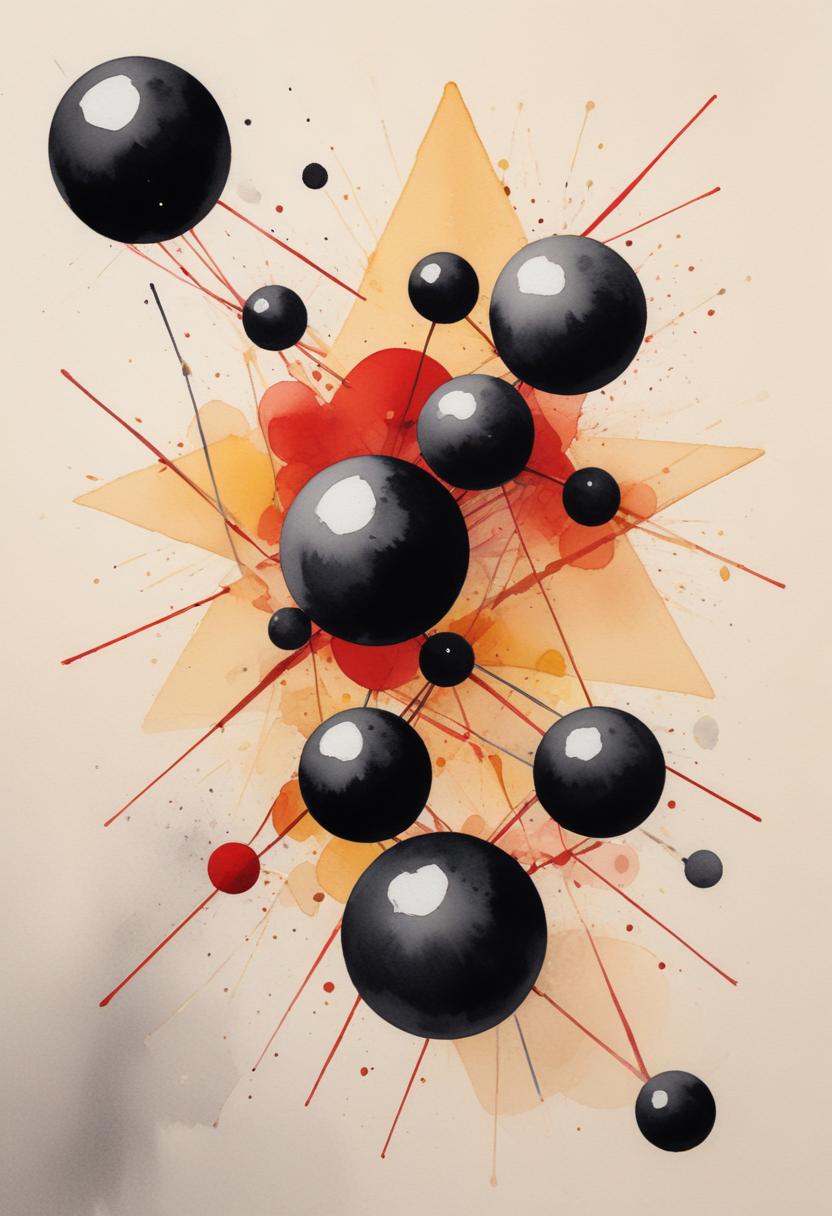 A watercolor painting features a cluster of black orbs connected by thin lines against a background of a large starburst in orange and red hues.