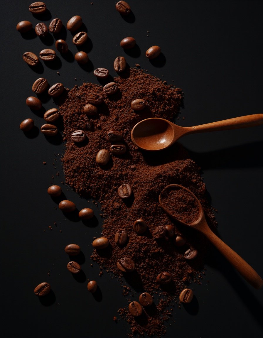 A dark surface is covered with coffee grounds and whole coffee beans. Two wooden spoons are positioned in the coffee grounds.
