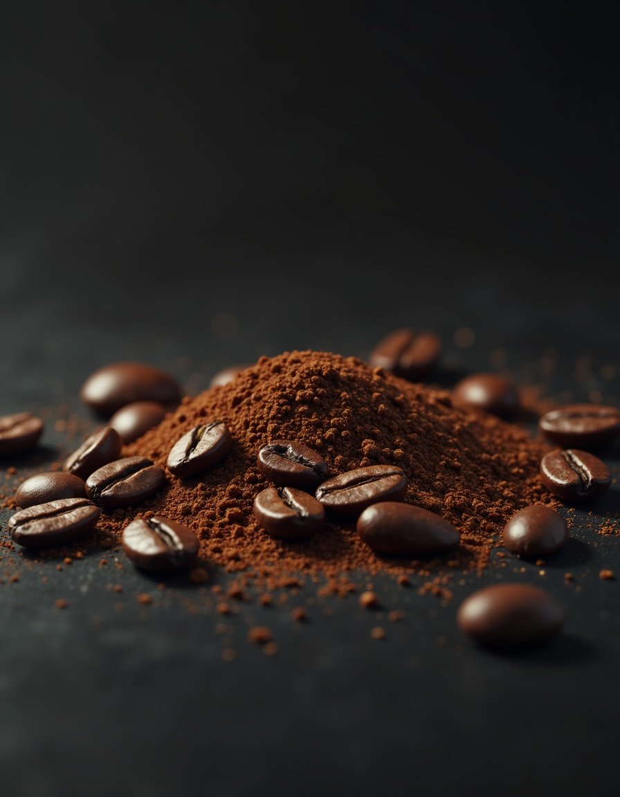 Ground coffee beans on a black surface