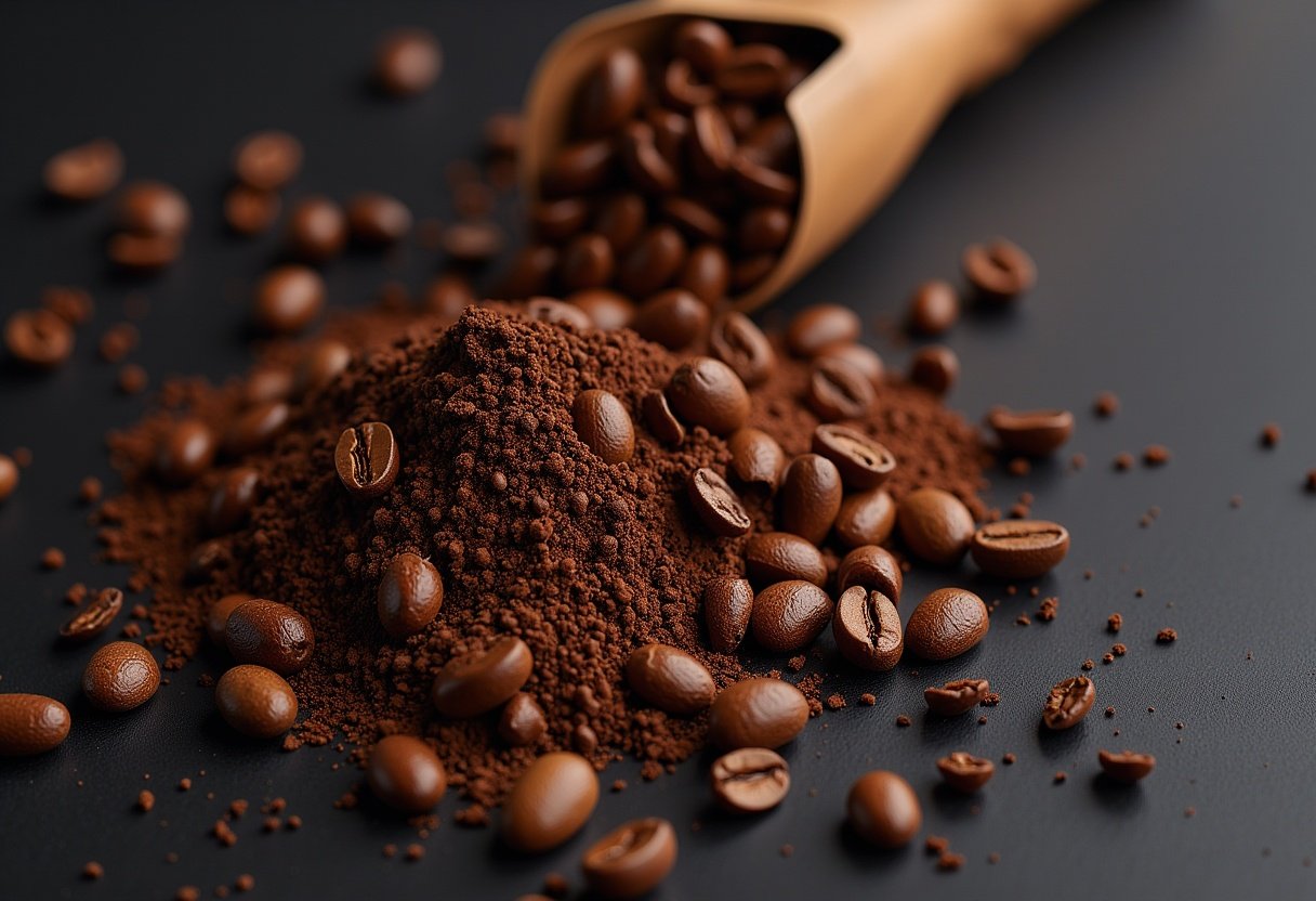 A pile of ground coffee beans surrounded by whole coffee beans. Some beans are scattered on a dark surface, creating a textured scene.