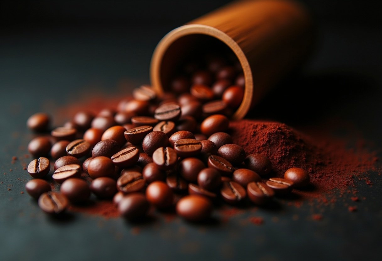 aroma, beverage, breakfast, brown, caffeine, cappuccino, coffee, coffee beans, cup, dark, dark roast, drink, energy, espresso, ground coffee, morning, scatter, spilled, surface, wooden