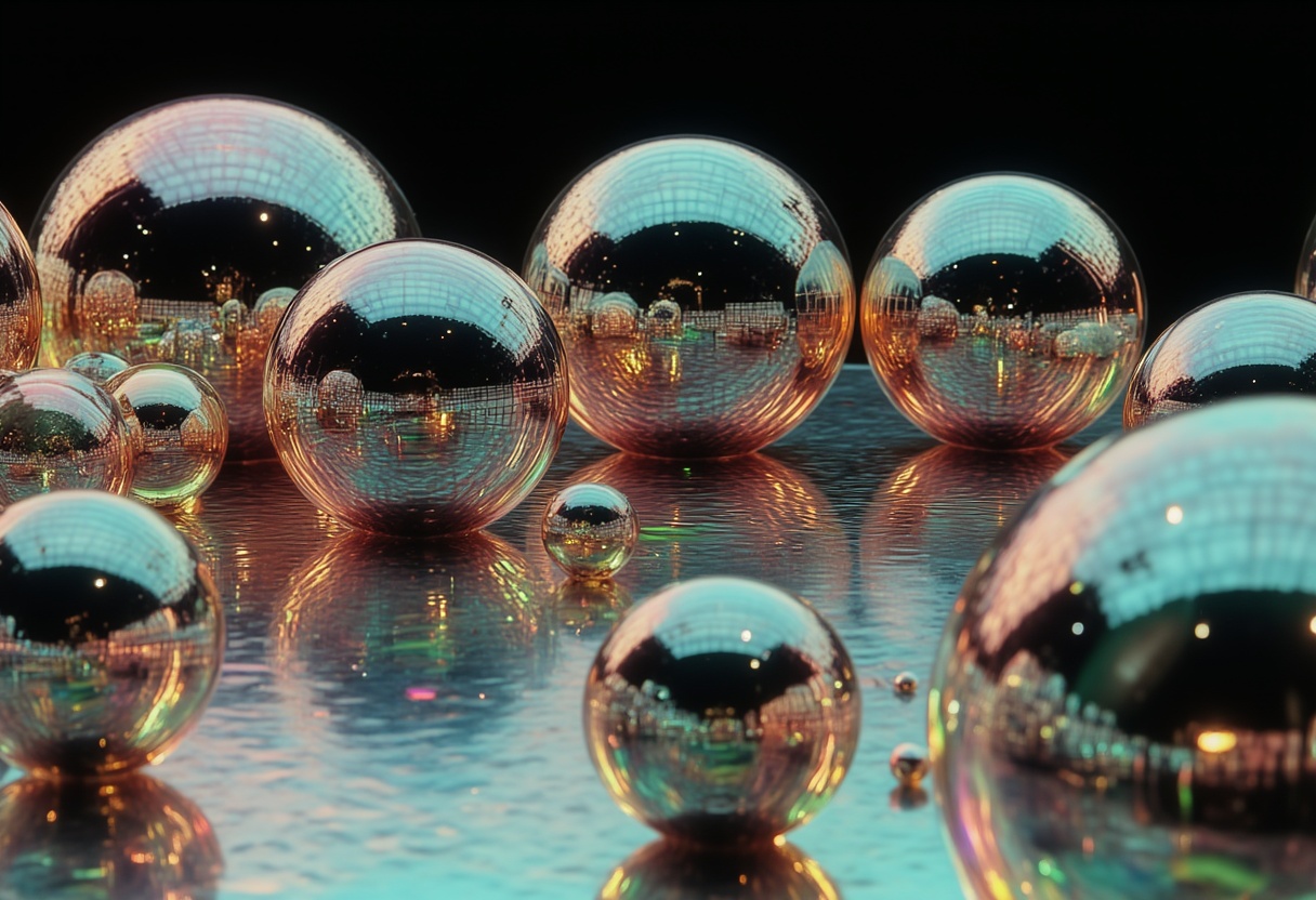Shiny spheres sit on a reflective surface