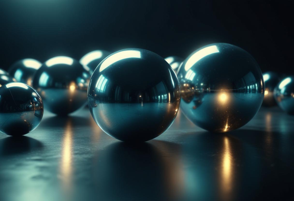 A group of shiny metallic spheres are arranged on a dark surface. The spheres reflect light from a source above, creating a warm glow.