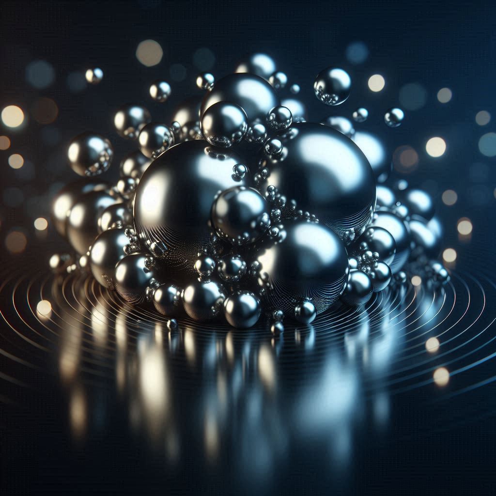 A collection of metallic spheres of various sizes rests on a black surface with concentric rings. The spheres are illuminated by warm, soft light.