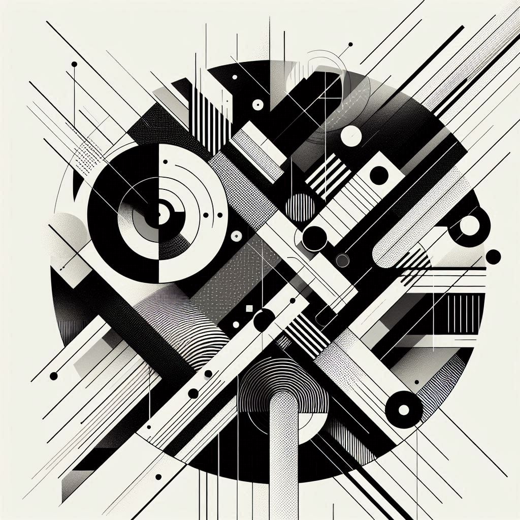 The image is a black and white abstract design composed of various geometric shapes and patterns, including circles, squares, lines, and dots.
