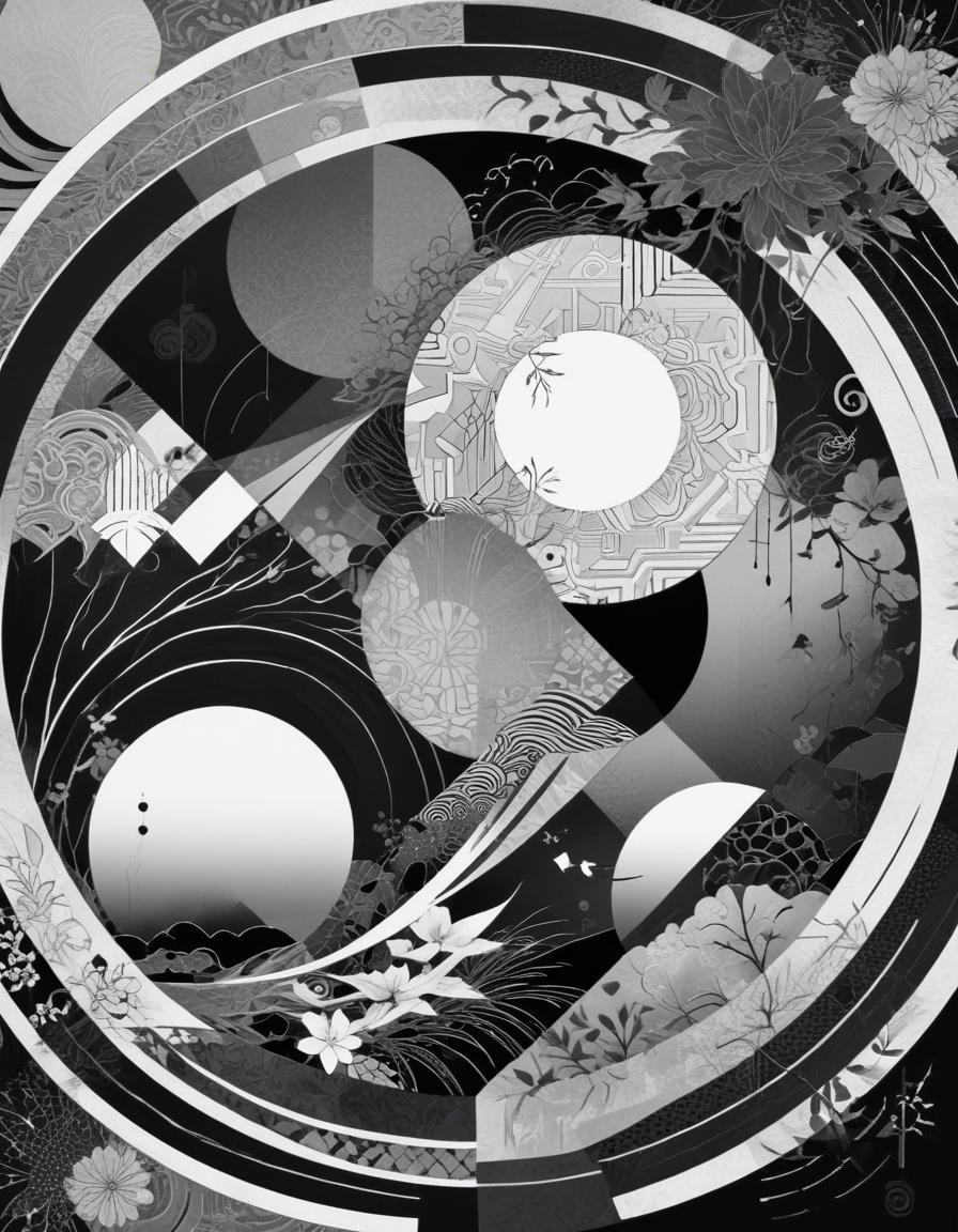 A black and white abstract design with circles and flowers