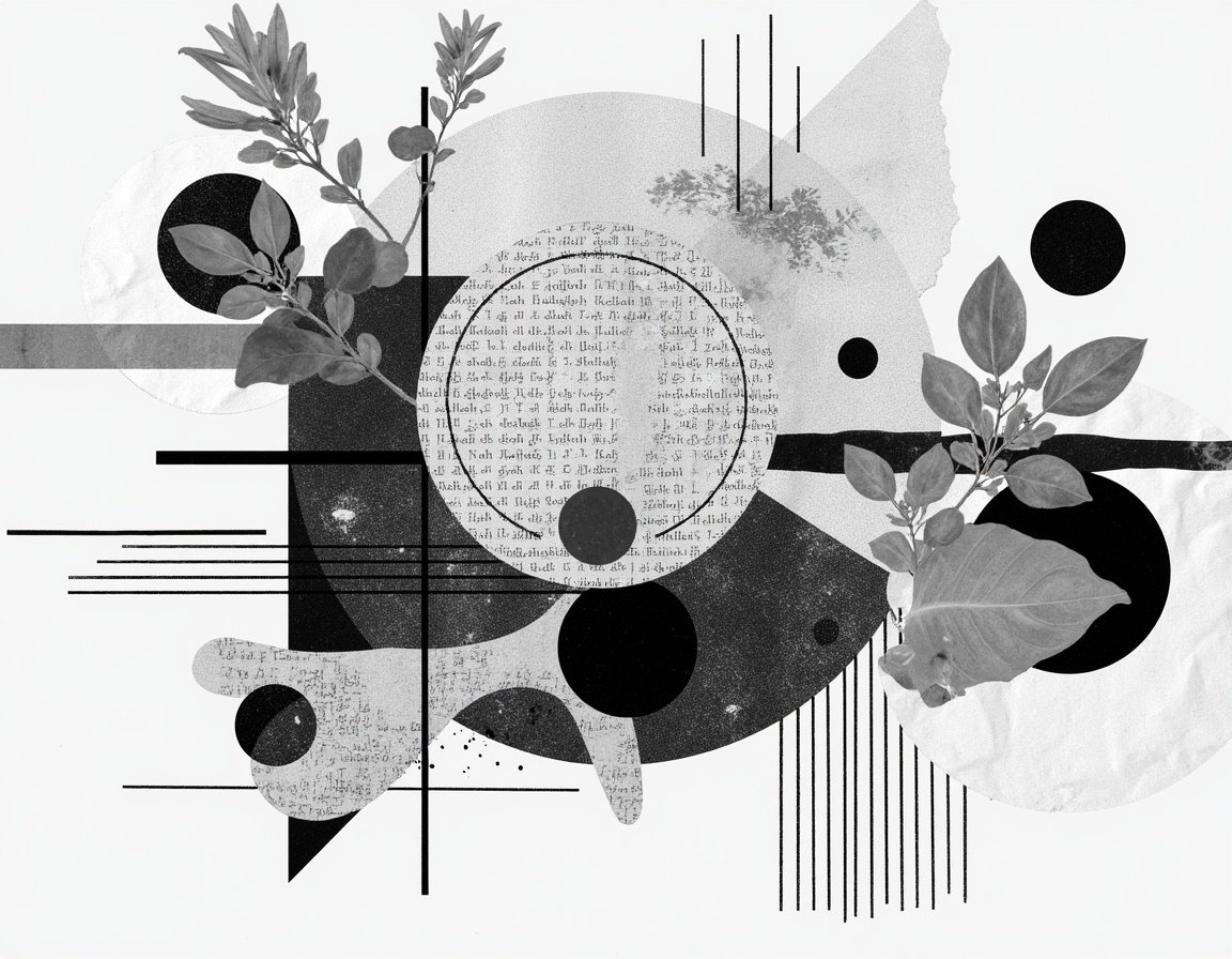 A black and white abstract design with geometric shapes, leaves, and text.