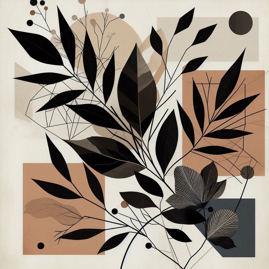 A digital illustration of a plant with black leaves and stems layered over geometric shapes in beige, brown, and gray.