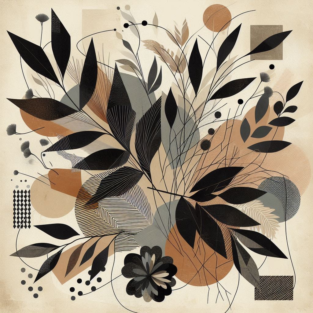 An abstract illustration featuring black leaves and branches, with geometric shapes in beige, brown, and gray.