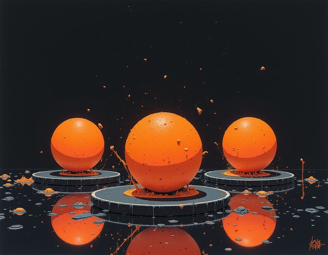 Three large orange spheres sit on circular platforms, two of which are partially submerged in a reflective liquid.