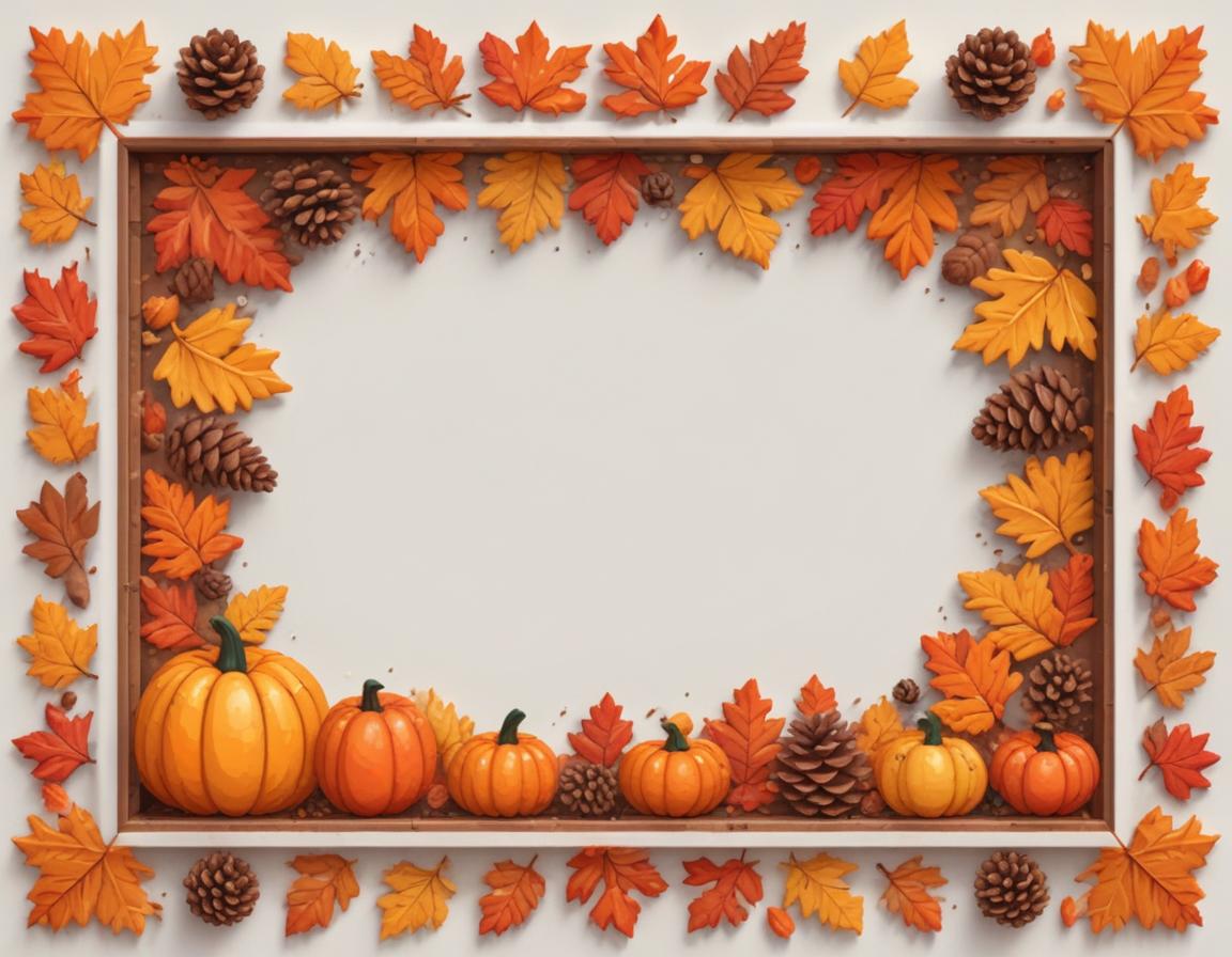 A white frame with a brown border is decorated with orange, yellow, and brown fall leaves, pine cones, and pumpkins.