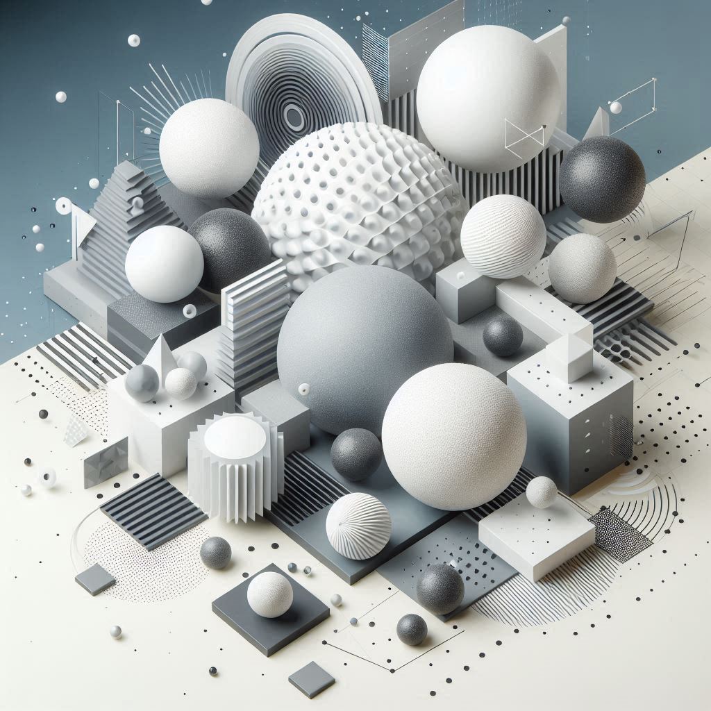 A collection of abstract geometric shapes, including spheres, cubes, pyramids, and circles, are arranged in a 3D design.