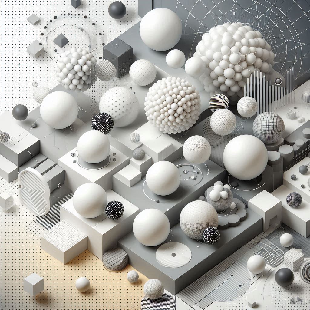 A collection of white spheres and geometric shapes, some smooth and some textured, are arranged in a visually interesting composition.