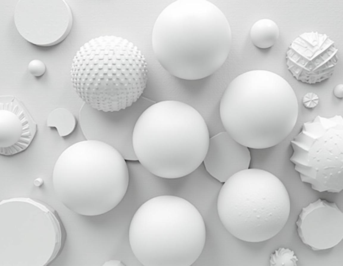 A white surface with multiple white spheres and textured round objects, some with a bumpy or spiky surface.