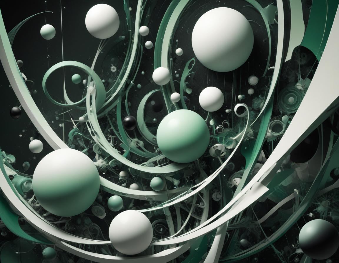 White and green spheres float amongst swirling, abstract shapes of green and white.