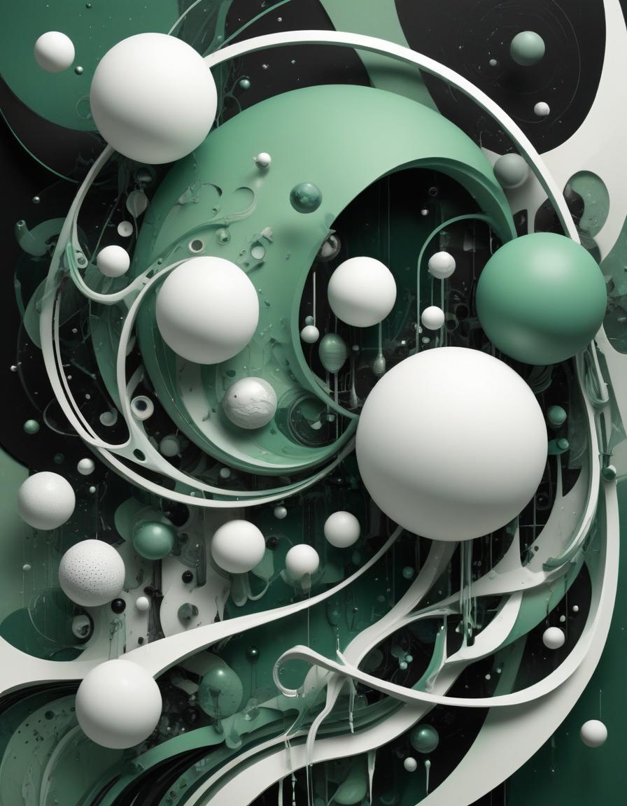 A digitally created image of white and green spheres floating in a swirling abstract design with white lines and a green background.