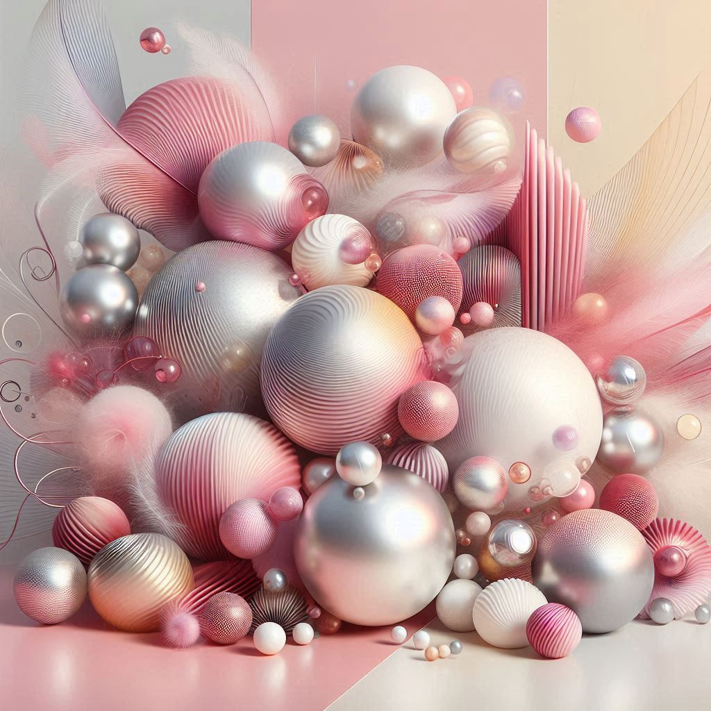 A collection of pink, silver, and white spheres, some with a rippled texture, arranged in a cluster on a pink and white surface.