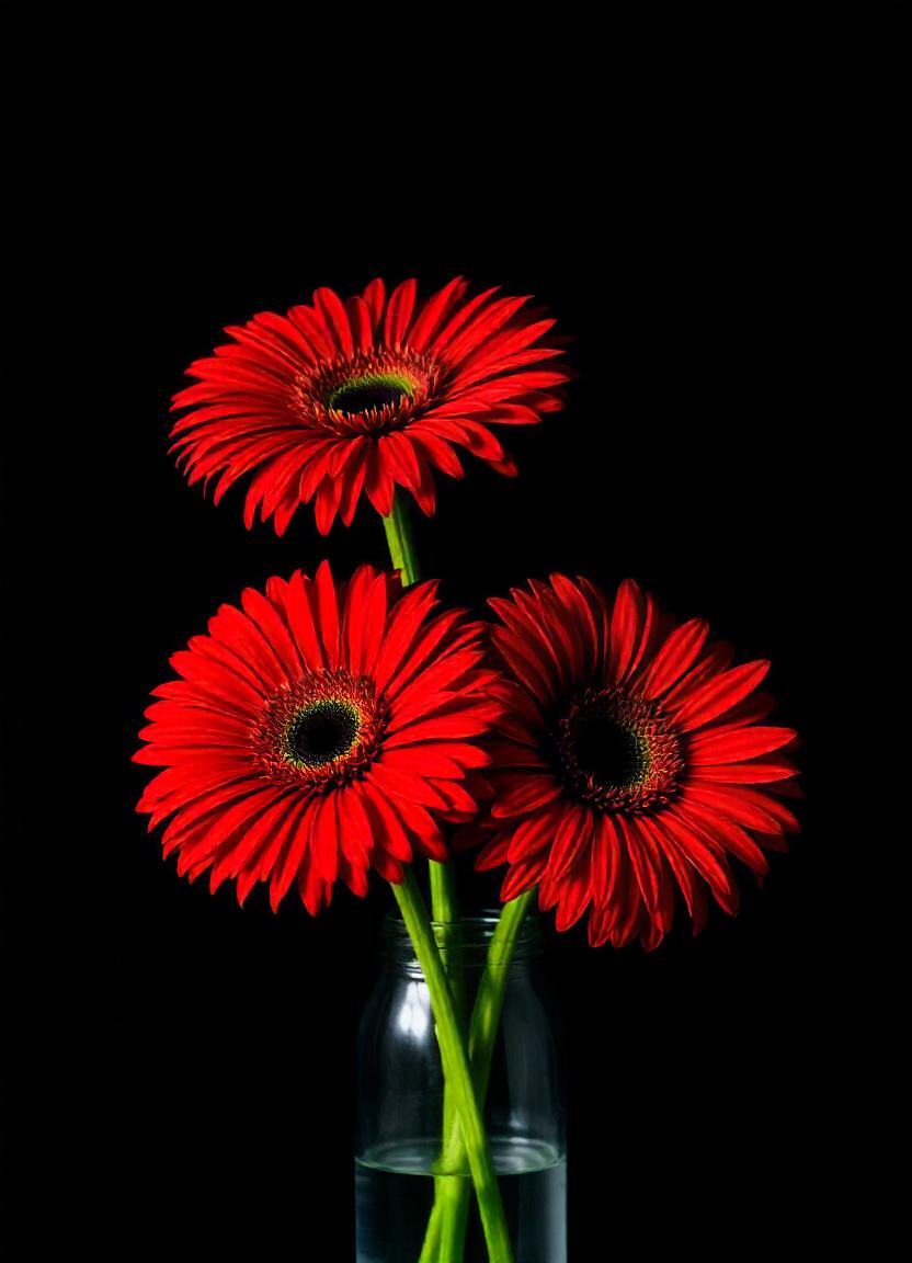 Three red gerbera daisies in a vase, black bg