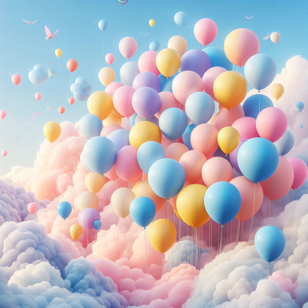 art, balloons, blue, celebration, clouds, colorful, dream, fantasy, float, flying, happy, illustration, joy, magical, pastel, pink, sky, whimsical, white, yellow