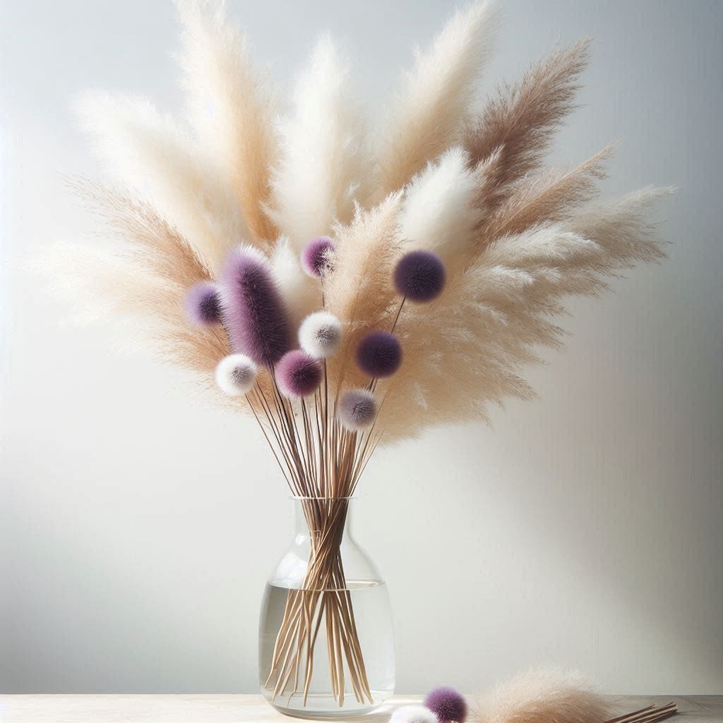 boho, bouquet, bud, decor, decoration, design, floral, flower, flowers, glass, grass, home decor, interior design, modern, pampas grass, purple, table, tabletop, vase, white
