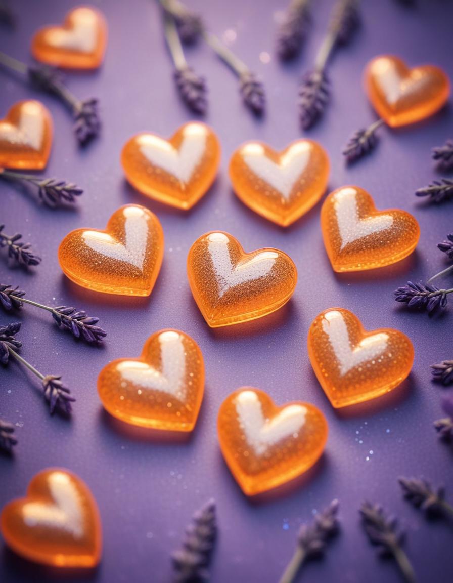 Orange heart-shaped objects lie on a purple surface, surrounded by dried lavender sprigs.