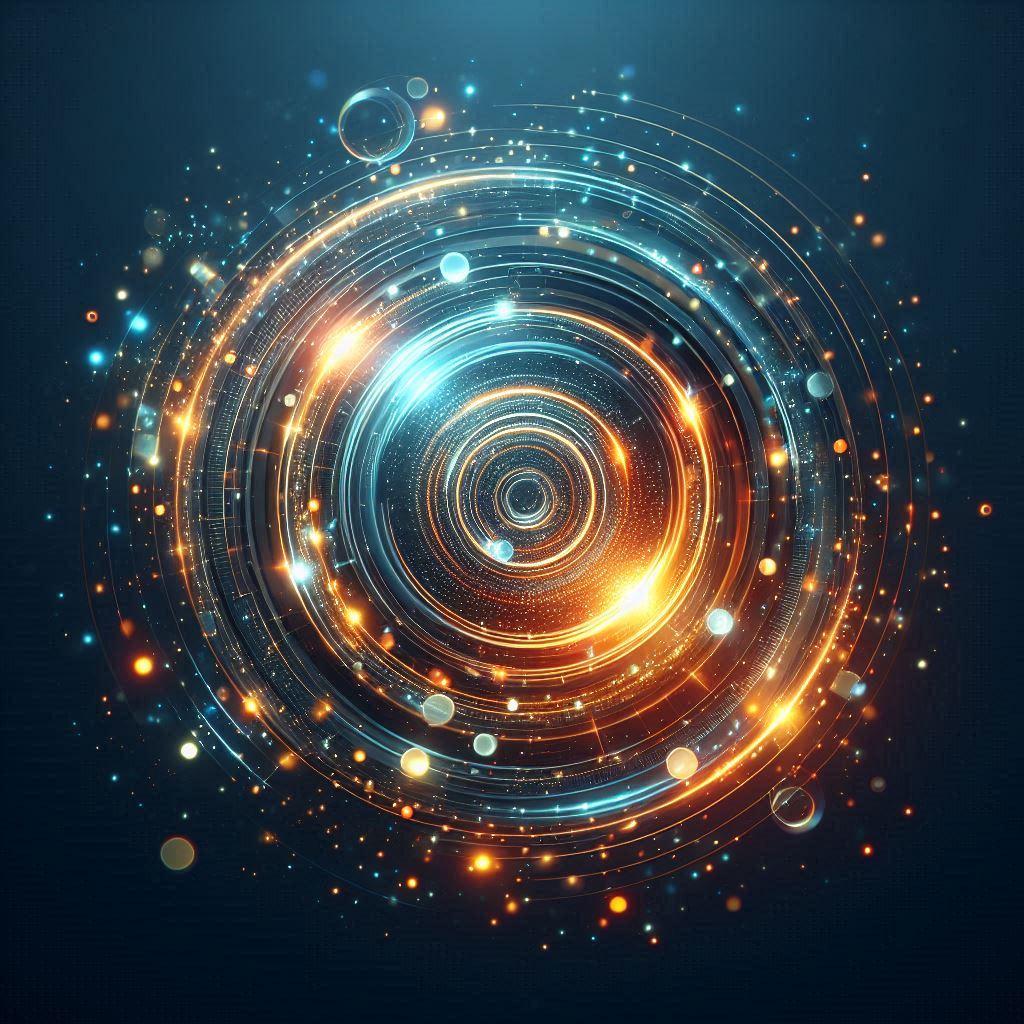 A dark blue background with bright concentric circles of light in orange and blue.