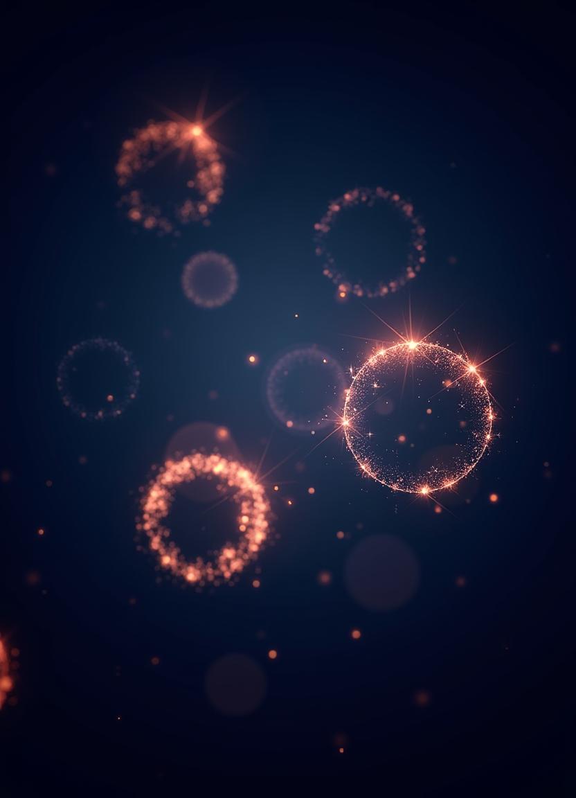 Sparkling circles float in a dark blue space