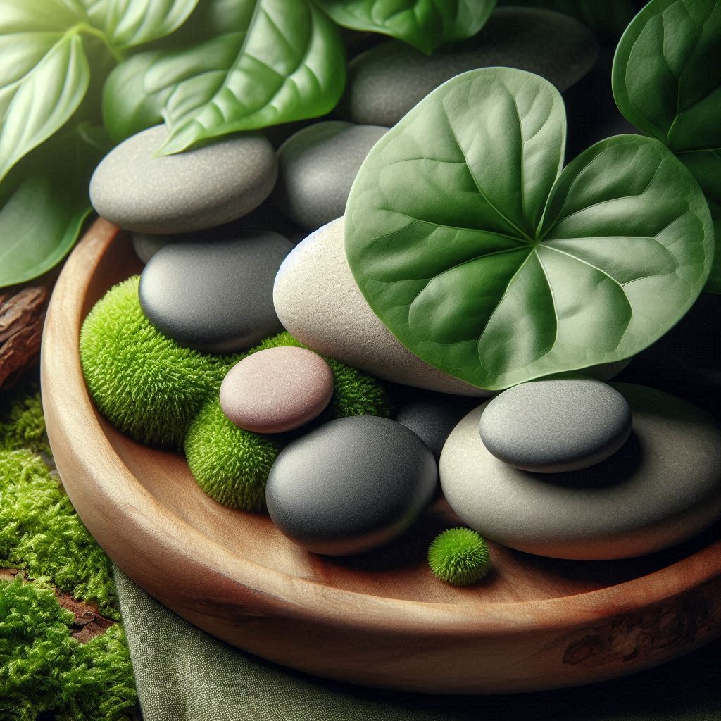 Smooth stones and green leaves create a serene scene