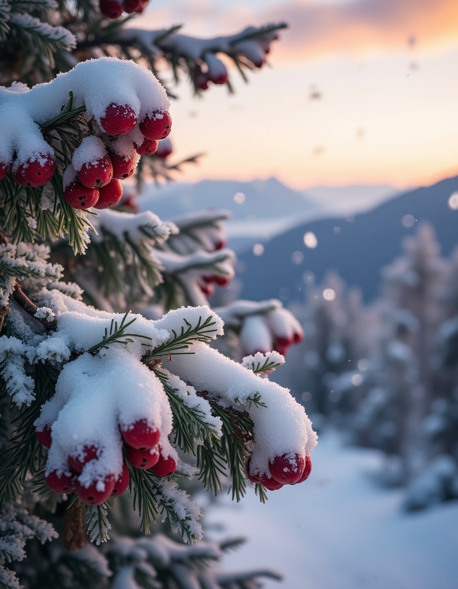 A close-up view of a snowy evergreen branch with bright red berries, set against a backdrop of snow-covered mountains and a hazy, golden sunrise.
