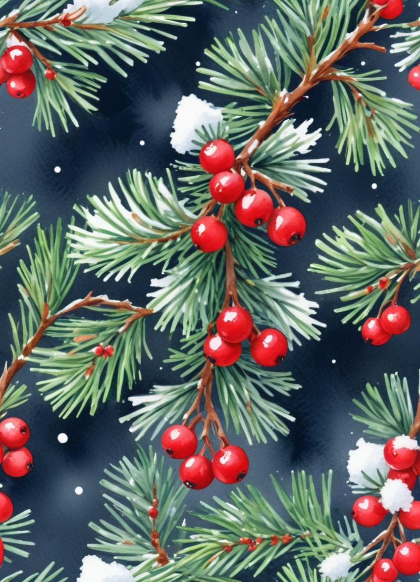 art, background, berries, branches, christmas, decoration, design, festive, green, holiday, illustration, nature, painting, pattern, pine, red, season, snow, watercolor, winter