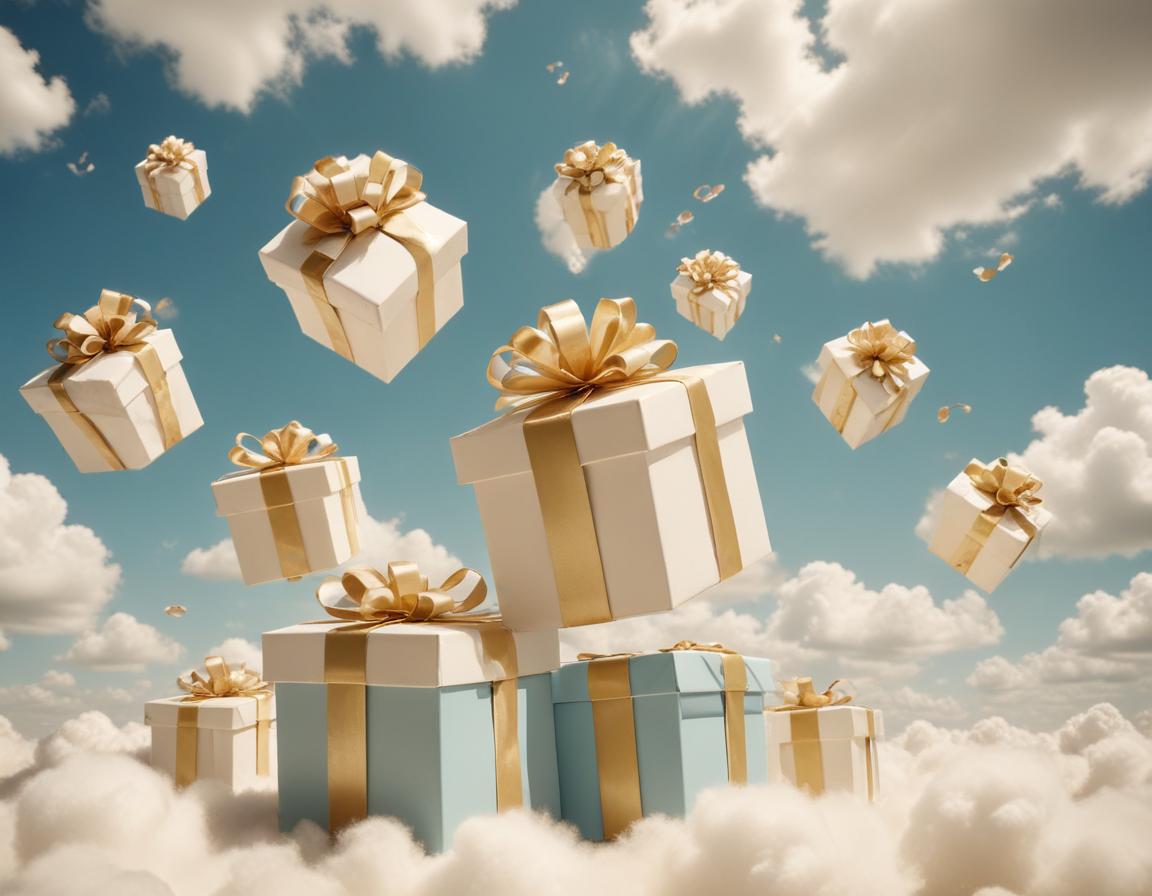 Many wrapped presents with golden ribbons and bows are falling from the sky into clouds on a sunny day.