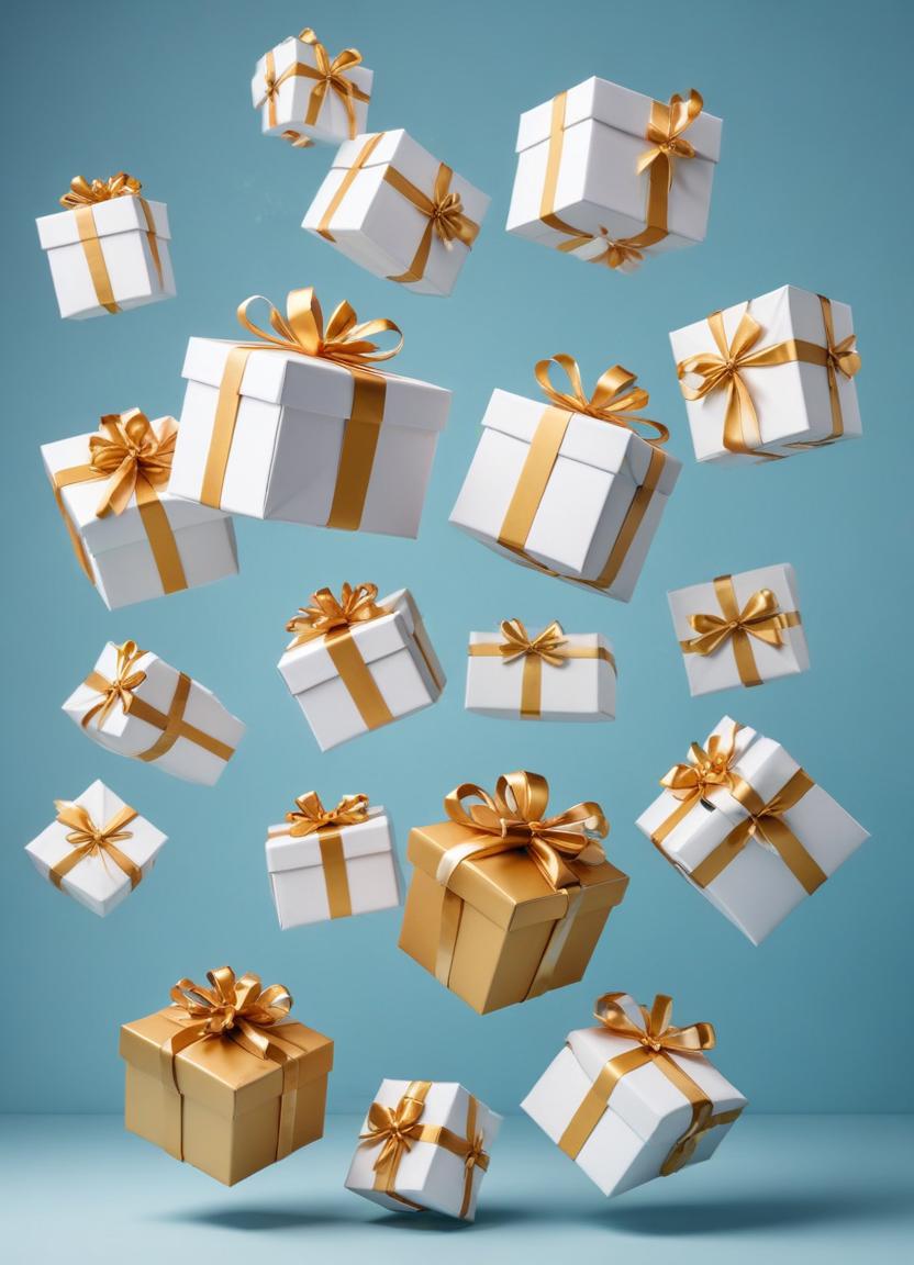 A group of white gift boxes with gold ribbon fall against a light blue background. There is one box that is completely gold with a gold ribbon.