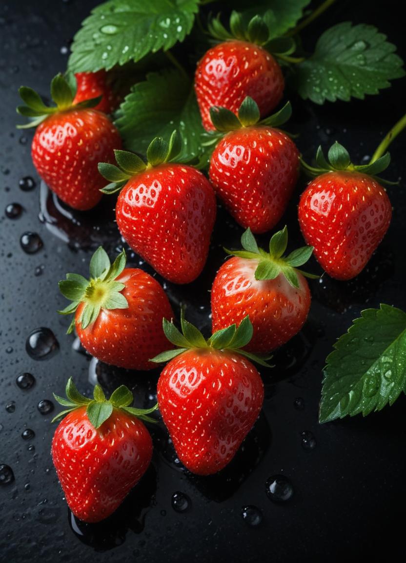 background, black, delicious, dew, drops, food, fresh, fruit, green, healthy, juicy, leaves, nature, organic, red, ripe, strawberries, surface, sweet, water