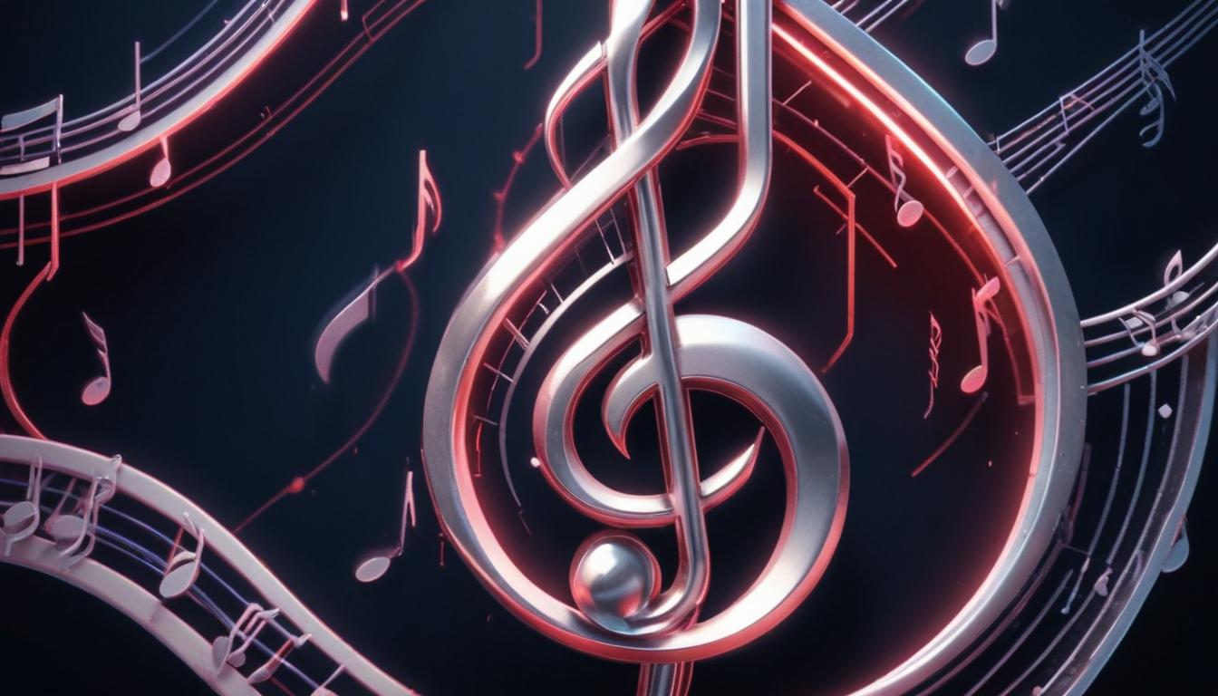 A stylized, silver treble clef with a red neon outline is the central focus of the image.