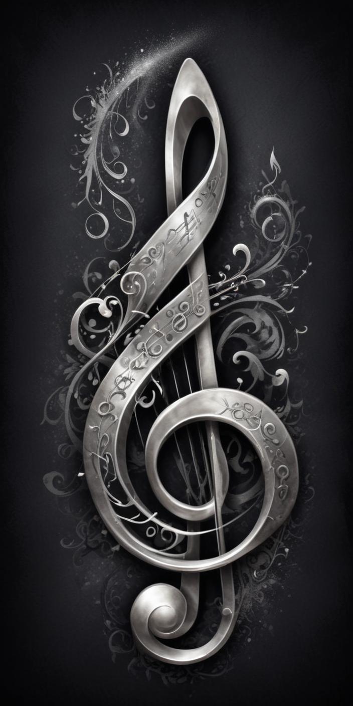A detailed, silver treble clef is rendered against a black background with an intricate, swirling design.