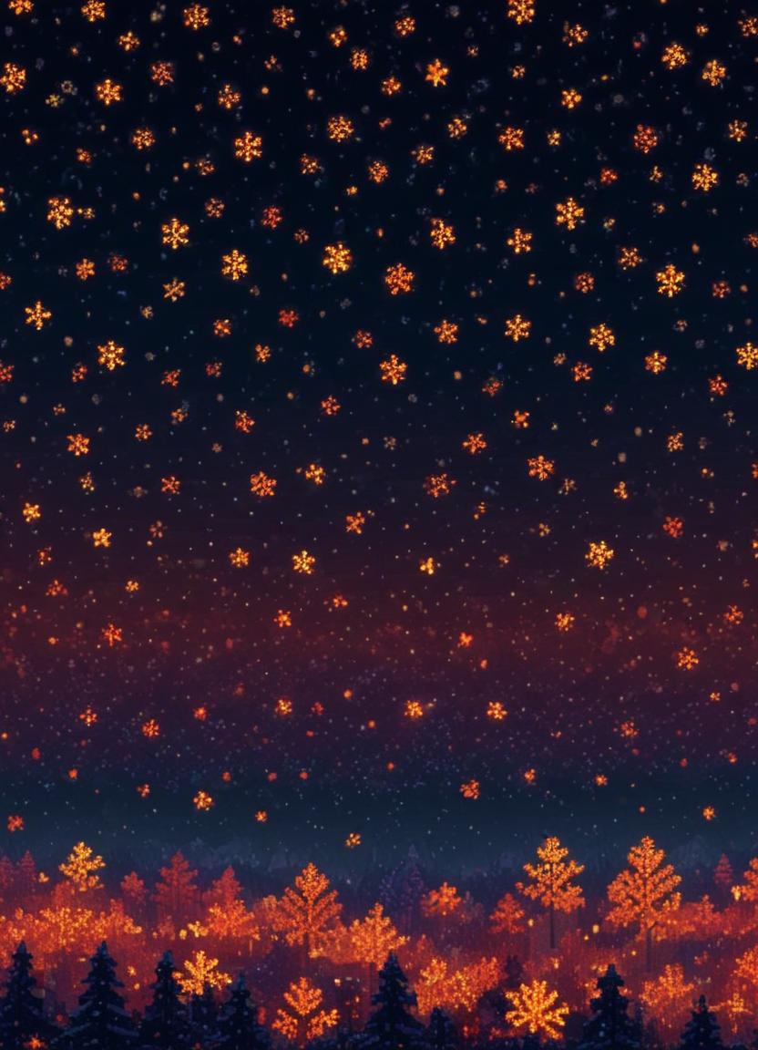 blue, christmas, dark, falling, festive, forest, glow, glowing, holiday, lights, magic, night, season, silhouette, sky, snow, trees, twinkling, warm, winter