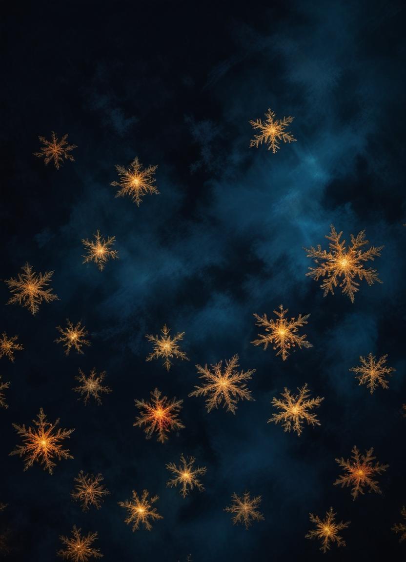 A dark blue sky with white clouds is filled with many golden snowflakes falling gracefully.