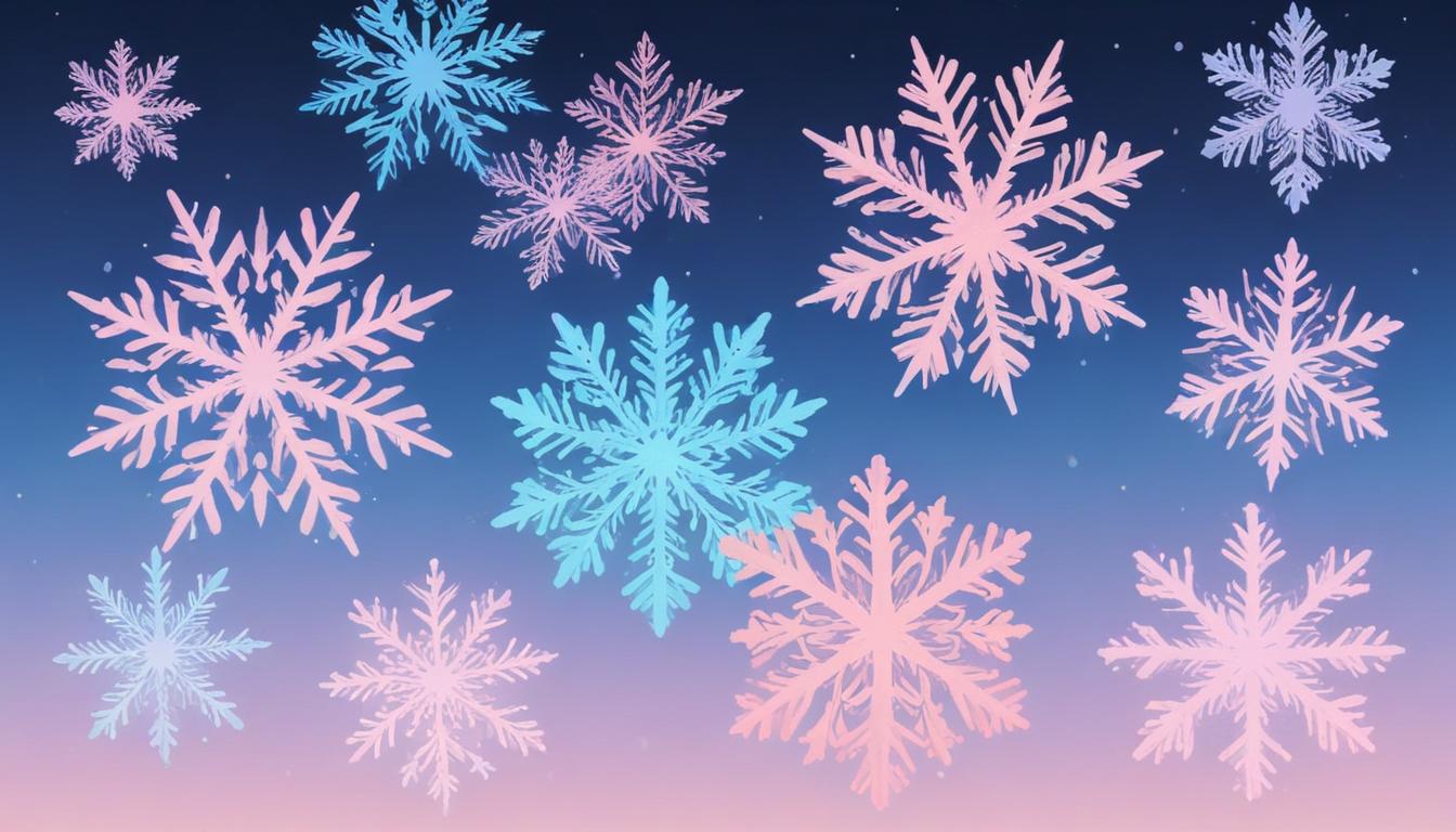 The image shows a blue sky with many pink and blue snowflakes falling.