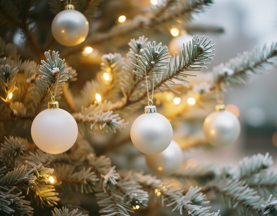 Close-up of a Christmas tree branch adorned with hanging white glass ornaments and golden accents. Twinkling warm lights illuminate the frosted green needles and shiny baubles. The bokeh background enhances the festive holiday glow.