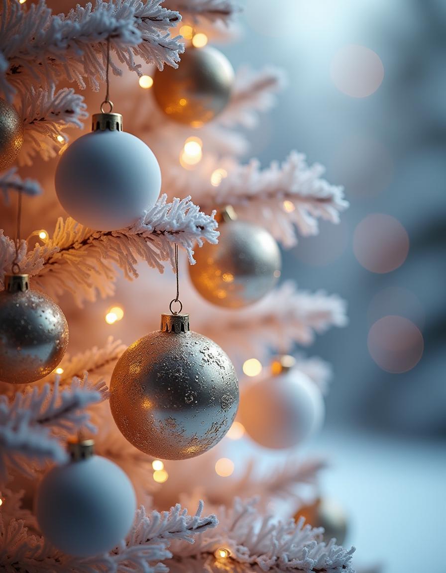baubles, blue ornaments, celebration, christmas, christmas decorations, christmas lights, christmas tree, cozy, december, festive, frosted branches, holiday, holiday decorations, lights, ornaments, silver ornaments, snow, string lights, white tree, winter