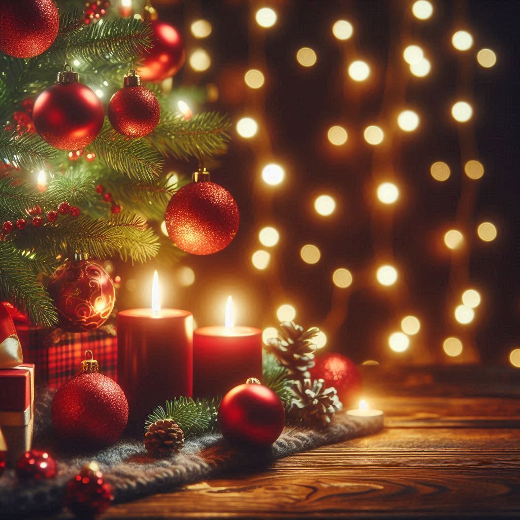 background, blurry, candle, christmas, decoration, festive, gift, glow, holiday, lights, ornament, pine, presents, red, season, sparkle, sprig, table, tree, wooden