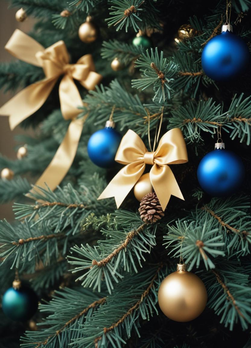 blue ornament, bow, celebration, christmas, christmas decoration, christmas ornament, christmas tree, december, decor, decoration, festive, gold bow, gold ornament, holiday, holiday season, ornaments, pine cone, pine tree, ribbon, winter